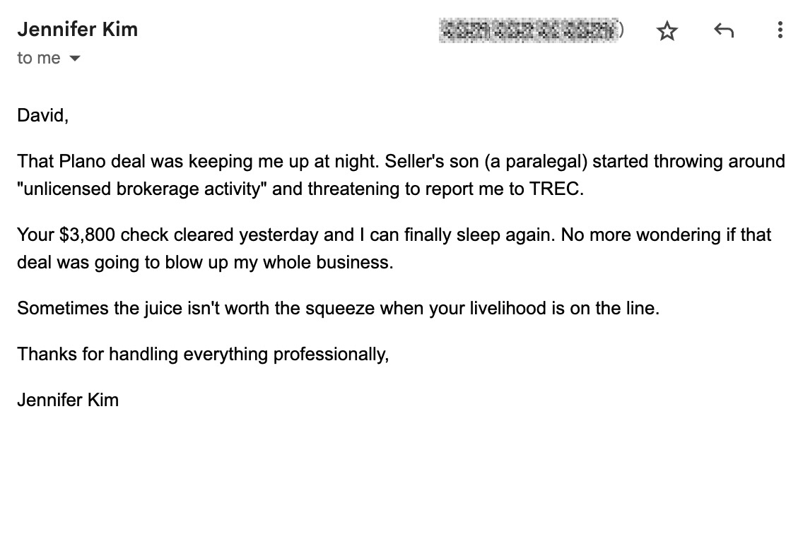Seller's son was a paralegal. Started screaming "unlicensed brokerage." Threatened TREC reports. Mentioned lawyers.